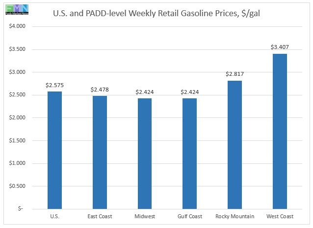 The U.S. Energy Information Administration (EIA) released its weekly data on diesel and gasoline retail prices for the week ended December 2, 2019. Price movements were modest. Gasoline prices declined by 0.4 cents/gallon, while diesel prices rose by 0.4 cents/gallon. National average prices for gasoline were $2.575/gallon, which was 12.4 cents/gallon above where they were in the same week one year ago. Until last week, gasoline prices had been below their levels from last year. On a national average basis, retail prices for diesel averaged $3.07/gallon, which was 13.7 cents/gallon lower than they were in the same week last year.