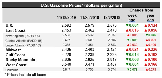 U.S. retail gasoline prices fell by 0.4 cents to average $2.575/gallon during the week ended December 2. Prices fell in PADDs 3, 4 and 5, while rising in PADDs 1 and 2. Retail prices for the current week were 12.4 cents per gallon higher than they were one year ago. Last week may have marked a turning point if price strength continues, because until then, gasoline prices had been below their levels of last year.