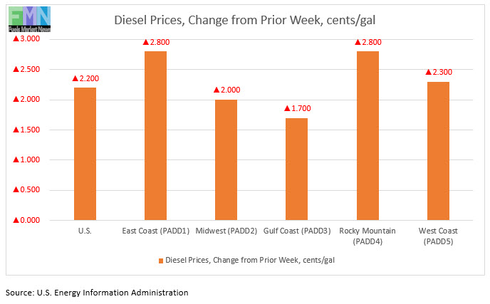 Retail diesel prices have now risen for the past thirteen weeks. Retail gasoline prices have risen for ten consecutive weeks.
