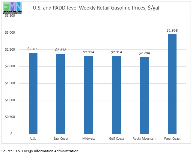 In the Rocky Mountains PADD 4 market, gasoline pump prices rose by 2.1 cents to average $2.284/gallon. This week’s PADD 4 prices were 24.2 cents/gallon lower than at the same time last year.