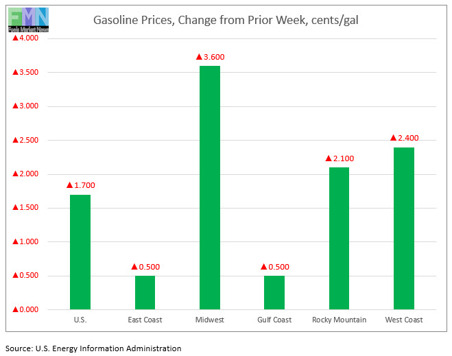 In the Midwest PADD 2 market, retail gasoline prices rose by 3.6 cents to average $2.278/gallon. This past week marked an inflection point for PADD 2 prices, which rose slightly above their levels of last year. PADD 2 prices for the week were 0.1 cents/gallon higher than they were for the same week last year.
