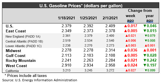 During the current week ended February 1, average retail prices for gasoline rose by 1.7 cents to average $2.409/gallon. Prices rose in all PADDs. Retail gasoline prices for the current week were 4.6 cents per gallon lower than they were one year ago.