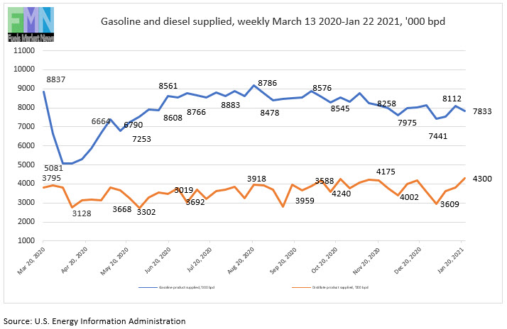 It now has been 46 weeks since the week of March 13, before widespread COVID-19 lockdowns caused demand to collapse. As of the week ended January 22, 2021, gasoline product supplied was 81% of its pre-pandemic level. Diesel product supplied was 107% of its pre-pandemic level.