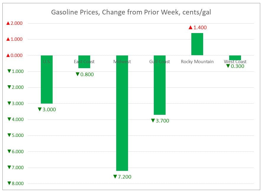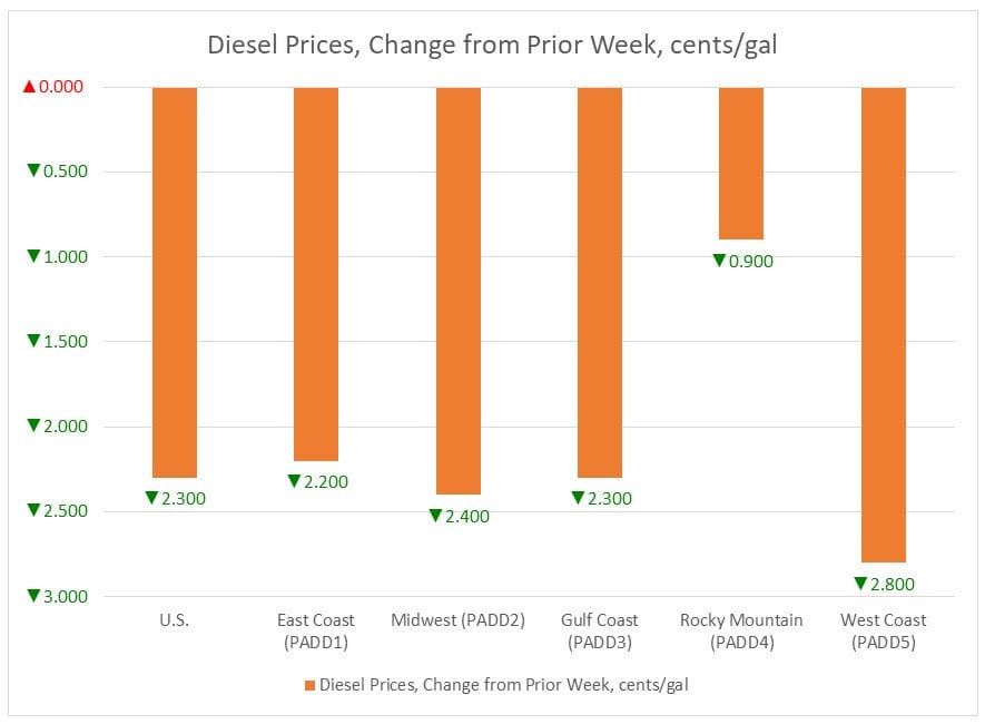 In the Midwest PADD 2 market, retail diesel prices fell by 2.4 cents to average $3.020/gallon. Two weeks prior, PADD 2 became the third PADD, following PADD 5 and PADD 1, to have retail diesel prices exceed $3 per gallon. Prices were 53.3 cents/gallon above their level for the same week last year.