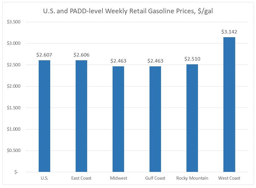 In the Gulf Coast PADD 3 market, gasoline prices fell by 3.7 cents to average $2.331/gallon. PADD 3 continues to have the lowest average prices among the PADDs. Prices for the week were 25.1 cents higher than for the same week in 2017.