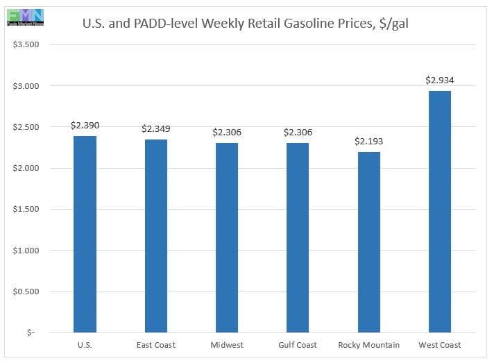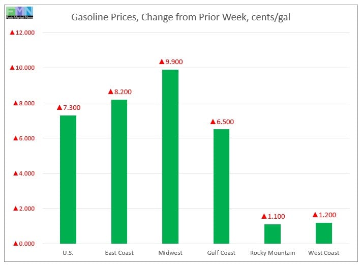 In the Midwest PADD 2 market, retail gasoline prices surged by 9.9 cents to reach an average price of $2.3.6/gallon. PADD 2 prices for the current week were 9.9 cents/gallon lower than they were for the same week last year.