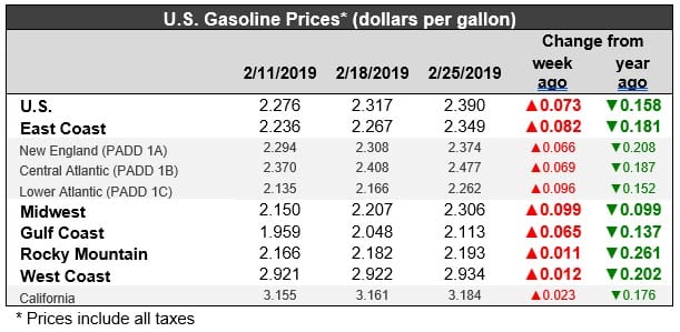 U.S. retail gasoline prices jumped by 7.3 cents to average $2.390/gallon during the week ended February 25. Prices rose in all PADDs. The national average price was 15.8 cents per gallon lower than it was one year ago. Gasoline retail prices have been creeping back up, but overall, prices remain low, and they are below their levels of last year. Gasoline prices are 51.3 cents/gallon below the peak price hit in early October.