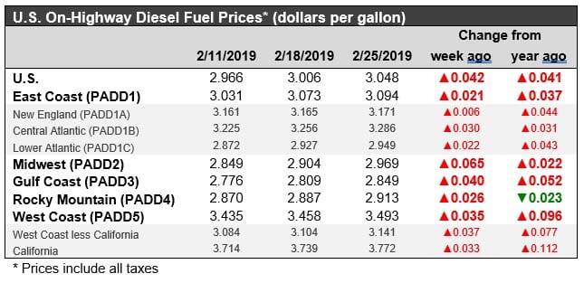 The U.S. Energy Information Administration (EIA) released its weekly data on diesel and gasoline retail prices for the week ended February 25, 2019. Prices for both fuels rose significantly in all PADDs. On a national average basis, retail prices for gasoline jumped by 7.3 cents/gallon, and diesel prices rose by 4.2 cents/gallon. In recent weeks, prices have been stabilizing, pulling out of the downward slide seen since prices peaked in October 2018. National average prices for gasoline remain below their levels from one year ago. However, diesel prices are higher than they were at the same time last year, and prices have risen above the $3/gallon level again.