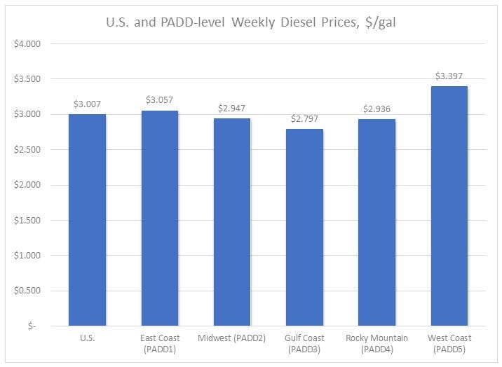 In the Midwest PADD 2 market, retail diesel prices fell by 2.3 cents to average $2.947/gallon. PADD 2 became the third PADD, following PADD 5 and PADD 1, to have retail diesel prices exceed $3 per gallon, but its prices have now receded below the $3/gallon level. Prices were 44.8 cents/gallon above their level for the same week last year.
