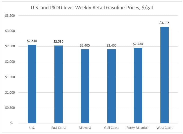 In the Rocky Mountains PADD 4 market, gasoline pump prices decreased by 3.2 cents to average $2.454/gallon. PADD 4 prices were 18.1 cents higher than at the same time in 2017.