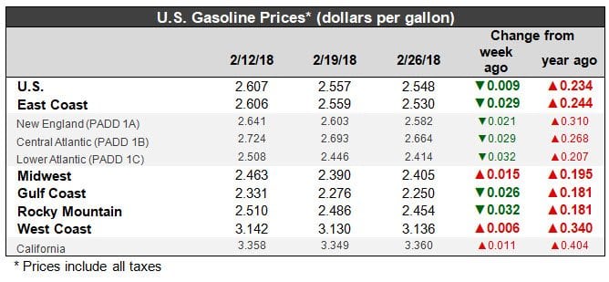 U.S. retail gasoline prices eased by 0.9 cents during the week ended February 26, to arrive at an average price of $2.548/gallon.