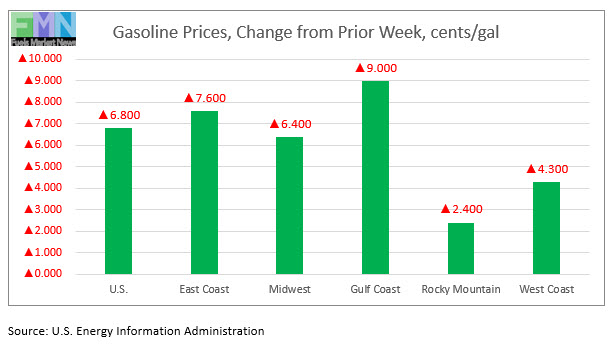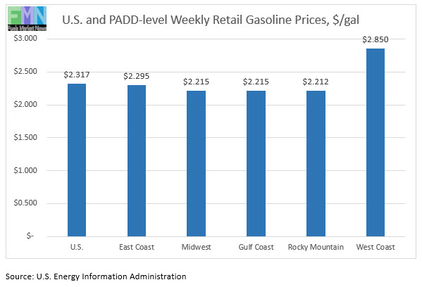 In the Midwest PADD 2 market, retail gasoline prices rose by 6.4 cents to average $2.215/gallon. PADD 2 prices for the week were 22.6 cents/gallon lower than they were for the same week last year.