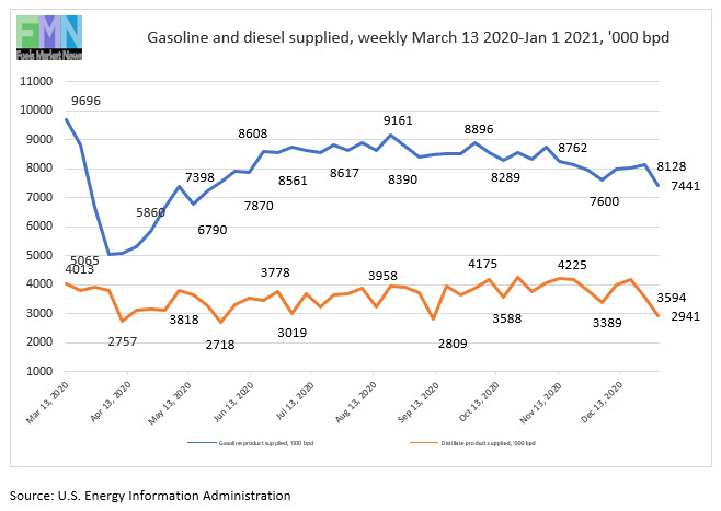 The EIA publishes weekly “product supplied” data as its proxy for demand. These data show gasoline demand crashing from 9,696 barrels per day (kbpd) during the week ended March 13 to just 5,065 kbpd during the week ended April 3, a huge hit of 4,631 kbpd in just four weeks. That was the low point. Demand thereafter trended generally up until it reached 8,608 kbpd during the week ended June 19. Since then, demand has cycled up and down, but it has never regained its March 13 level. Apparent demand recovered to 8,809 kbpd during the week ended July 24, retreated to 8,617 kbpd during the week ended July 31, then jumped to 9,161 kbpd during the week ended August 21. Since then, demand has been in the range of 7,600-8,900 kbpd. It rose to 8,896 kbpd during the week ended October 2, then fell again over the ensuing two weeks. Gasoline product supplied averaged 8,128 kbpd during the week ended December 25, then dropped sharply to 7,441 kbpd during the most recent week ended January 1, 2021. The EIA points out that “product supplied” is not a precise measure of demand, but these data provide the most up-to-date numbers publicly available.