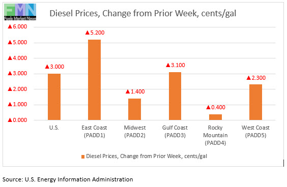 In the East Coast PADD 1, diesel prices rose by 5.2 cents to reach an average of $2.719/gallon. Within PADD 1, New England prices rose by 3.5 cents to average $2.70/gallon. Central Atlantic diesel prices increased by 3.4 cents to average $2.891/gallon. Lower Atlantic prices rose by 6.8 cents to average $2.608/gallon. PADD 1 prices were 39.2 cents/gallon below their levels for the same week last year.