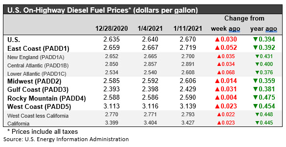 The week ended January 11 brought a 3.0 cents per gallon increase in the retail price for diesel to reach an average price of $2.670/gallon. Prices rose in all PADDs. The national average price for the week was 39.4 cents/gallon below where it was during the same week last year. Retail diesel prices have risen for ten consecutive weeks now. However, looking at 2020 in its entirety, prices dropped 44.4 cents per gallon between the first week of January and the last week of December.