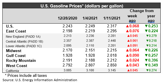 During the current week ended January 11, average retail prices for gasoline rose by 6.8 cents to average $2.317/gallon. Prices rose in all PADDs. Retail gasoline prices for the current week were 25.3 cents per gallon lower than they were one year ago.