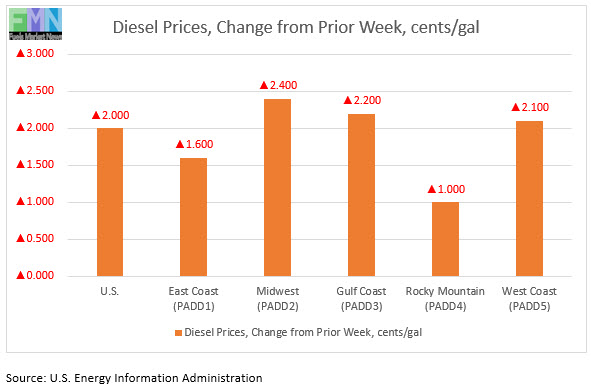 Retail diesel prices have now risen for the past 12 weeks. Retail gasoline prices have risen for nine consecutive weeks.