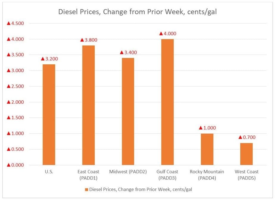 In the West Coast PADD 5 market, retail prices rose by 0.7 cents to average $3.401/gallon. This price was 54.6 cents above its level from last year. Prices excluding California increased by 1.1 cents to average $3.098/gallon, which was 34.3 cents above the retail price for the same week last year. California diesel prices edged up by 0.3 cents to an average price of $3.641/gallon. This price was 70.4 cents higher than last year’s price. Until last week, PADD 5 had been the only PADD to have diesel prices above $3 per gallon. The upward trend around the country now has brought retail averages above the $3/gallon mark on the national level.