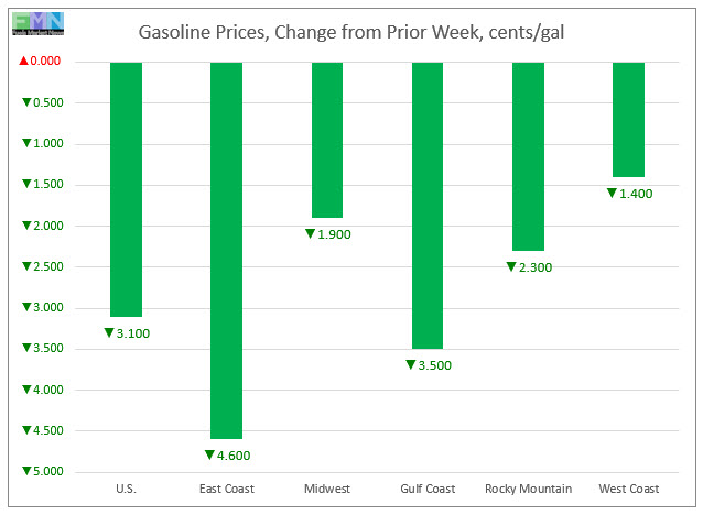 In the Midwest PADD 2 market, retail gasoline prices declined by 1.9 cents to average $2.371/gallon. PADD 2 prices for the current week were 31.9 cents/gallon higher than they were for the same week last year.