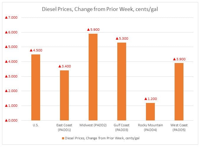 In the Midwest PADD 2 market, retail diesel prices rose significantly by 5.9 cents to average $3.03/gallon. PADD 2 is now the third PADD, following PADD 5 and PADD 1, to have retail diesel prices exceed $3 per gallon. Prices were 53.0 cents/gallon above their level for the same week last year.