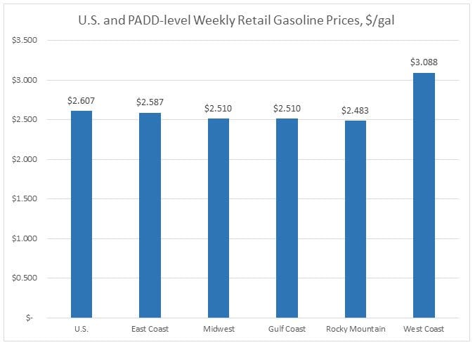 In the Rocky Mountains PADD 4 market, gasoline pump prices increased by 1.1 cents to average $2.483/gallon. PADD 4 prices were 22.8 cents higher than at the same time in 2017.
