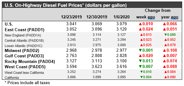 For the current week ended January 6, retail diesel prices rose by 1.0 cent to arrive at an average price of $3.079/gallon. Retail diesel prices had been below the $3/gallon mark until the attacks on Saudi Arabian oil facilities in mid-September, but they have remained steadily above the $3/gallon mark since then. Leading up to this event, between mid-October 2018 and late-January 2019, retail diesel prices fell for fourteen consecutive weeks. During those fourteen weeks, the price decline totaled 42.9 cents/gallon. From February through April, diesel prices crept back up by 20.4 cents/gallon. The month of May brought a modest reversal in the upward trend in diesel prices. During the five weeks of June including the week ended July 1st, diesel prices fell more substantially, declining by 10.9 cents/gallon. For the current week ended January 6th, diesel prices rose in PADDs 1 and 3, while falling in PADDs 2, 4 and 5. The national average price for the week was 6.6 cents/gallon above where it was during the same week last year.