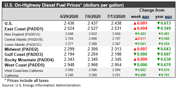 The week ended July 13 brought a 0.1 cent/gallon increase in the retail price for diesel. For the year to date, diesel prices have fallen by a cumulative 64.1 cents/gallon, a major downward slump that is reversing gradually. In the autumn of 2019, retail diesel prices had been below the $3/gallon mark until the attacks on Saudi Arabian oil facilities in mid-September 2019. They rose at that time, and they remained above the $3/gallon mark until the week ended Feb. 3, 2020. Prices then continued to slide. For the current week, retail diesel prices rose by 0.1 cent to arrive at an average price of $2.438/gallon. Prices rose in PADDs 1 and 2, fell in PADDs 3 and 5, and were unchanged in PADD 4. The national average price for the week was 61.3 cents/gallon below where it was during the same week last year.