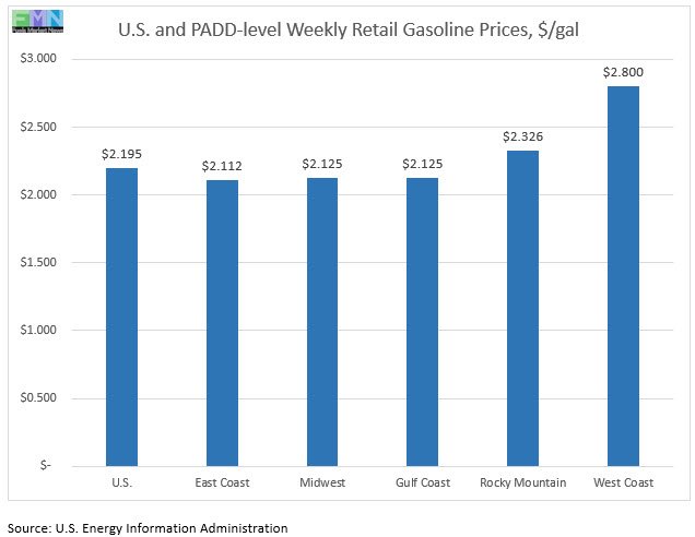In the Midwest PADD 2 market, retail gasoline prices rose by 2.3 cents to average $2.125/gallon. PADD 2 prices for the week were 63.8 cents/gallon lower than they were for the same week last year.