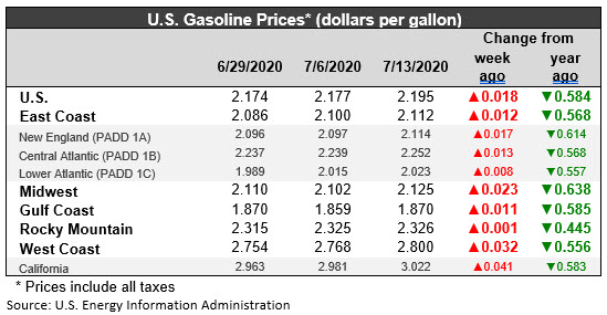 The COVID-19 pandemic is having a massive impact on the U.S. gasoline market. With the phased re-opening of the economy, demand is rising, as are prices. However, the economic reopening has led to a massive increase in coronavirus infections, and some states are being forced to rethink their strategies, particularly regarding indoor dining and drinking. During the week ended June 8, U.S. retail gasoline prices finally regained the $2/gallon threshold, after falling below this level during the week ended April 6 and remaining there for the next nine weeks. During the current week ended July 13, average retail prices for gasoline rose by 1.8 cents/gallon to average $2.195/gallon. Prices rose in all PADDs. Retail gasoline prices for the current week were 58.4 cents per gallon lower than they were one year ago. Until November, gasoline prices had been below their levels of last year. Prices then rose to surpass last year’s levels in all PADDs. The downhill price slide changed this, making gasoline a bargain. Until the pandemic, it had been over four years since the average retail price for gasoline was below the $2/gallon mark.