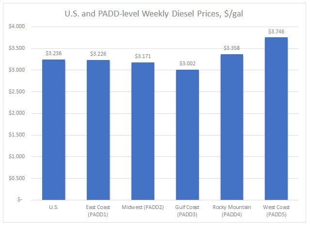 For the current week ended July 16, diesel prices decreased by 0.4 cents to settle at an average price of $3.239/gallon. Prices fell in all PADDs, albeit modestly. The national average price was 74.8 cents per gallon higher than it was one year ago.