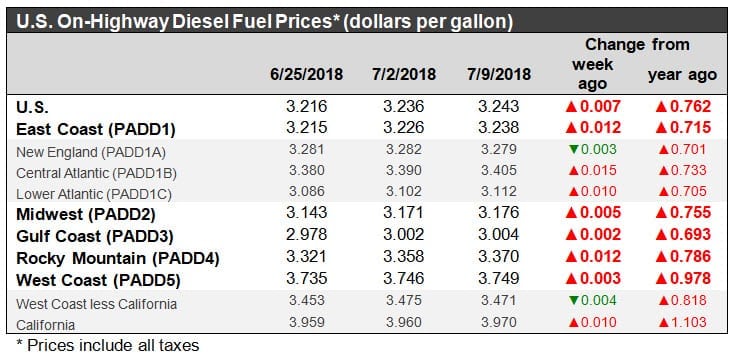 In the West Coast PADD 5 market, retail gasoline prices dropped by 1.6 cents to arrive at an average of $3.378/gallon. This was 57.1 cents higher than at the same time a year ago. PADD 5 continues to have the highest gasoline prices among the five PADDs. During the year to date, PADD 5 has been the only PADD where retail gasoline prices have exceeded $3/gallon. Excluding California, West Coast prices declined by 1.6 cents to average $3.185/gallon. This was 59.7 cents higher than at the same time in 2017. In California, pump prices fell by 1.5 cents to average $3.535/gallon. California prices were 60.1 cents per gallon above their levels from last year.
