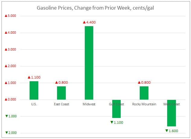 In the Midwest PADD 2 market, retail gasoline prices rose by 1.5 cents to arrive at an average price of $2.796/gallon. Gasoline pump prices were 61.5 cents higher than they were one year ago.