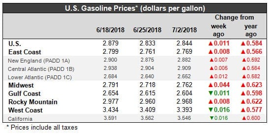 U.S. retail gasoline prices rose by 0.8 cents to average $2.865/gallon during the week ended July 16. Prices rose in PADDs 1 and 2. Prices fell in PADDs 3, 4 and 5. The national average price was 58.7cents per gallon higher than it was one year ago.