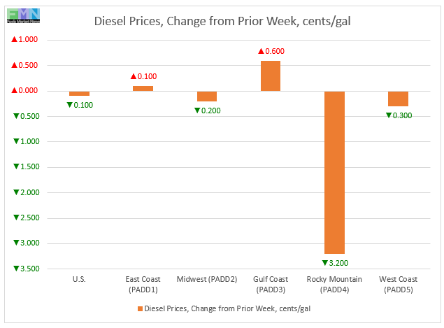 In the Rocky Mountains PADD 4 market, retail diesel prices dropped by 3.2 cents to settle at an average of $2.998/gallon. This was the largest price decrease among the PADDs. PADD 4 now joins PADDs 3 and 2 in having diesel prices below $3/gallon. PADD 4 prices were 36.0 cents lower than for the same week in the prior year.