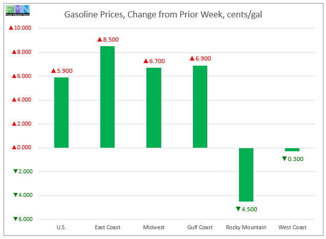 In the Gulf Coast PADD 3 market, gasoline prices increased by 6.9 cents to average $2.368/gallon. PADD 3 continues to have the lowest average prices among the PADDs. Prices for the week were 23.6 cents lower than for the same week last year.