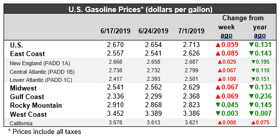 During the week June 21-July 1, 2019, West Texas Intermediate (WTI) crude futures rose by $1.96/b (3.4%.) Gasoline futures prices soared by 12.34 cents/gallon (6.9%.) Diesel futures prices rose by 6.58 cents/gallon (3.5%.) Global oil prices have been rising alongside geopolitical tensions. The loss of the PES refinery is now constraining U.S. gasoline supplies, which caused prices to rise. Although the relationship between futures market prices and retail prices is not immediate and one-for-one, the most recent trend in futures prices suggests that the recent easing of gasoline and diesel retail prices is over, and that retail prices will rise in the coming week.