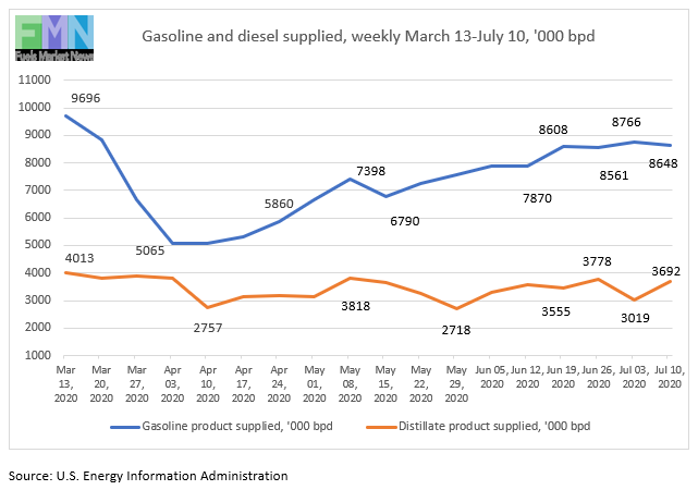 Diesel demand dropped sharply in response to COVID-19, and it is recovering in fits and starts. Diesel demand stagnated at first, recovered somewhat, then began to vacillate between approximately 3,000 kbpd and 3,800 kbpd. The EIA reported that distillate fuel oil demand plunged by 1,256 kbpd between the week ended March 13 and the week ended April 10, slumping from 4,013 kbpd to 2,757 kbpd in a four-week period. During the week ended July 10, diesel demand averaged 3,692 kbpd.
