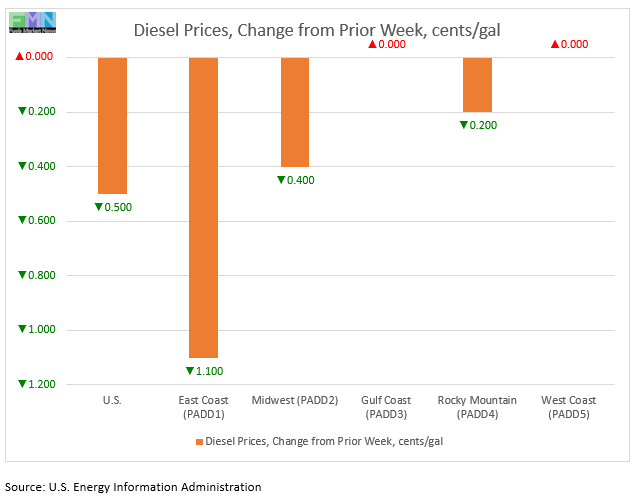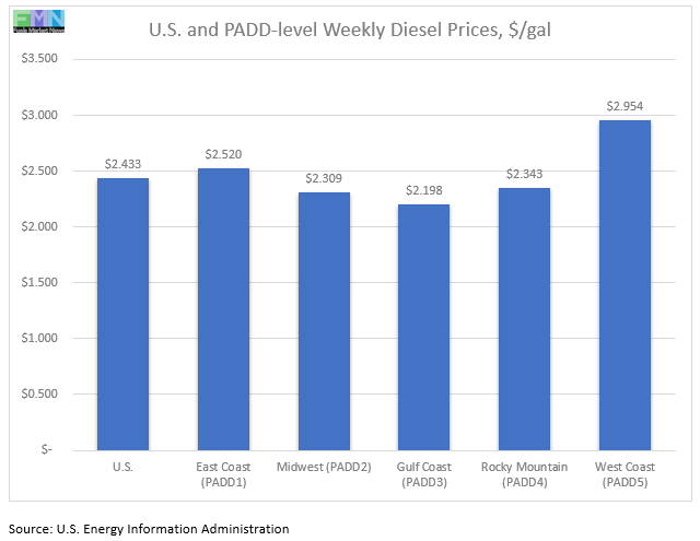In the East Coast PADD 1, diesel prices fell by 1.1 cents to average $2.520/gallon. Within PADD 1, New England prices fell by 2.4 cents to average $2.626/gallon. Central Atlantic diesel prices decreased by 0.8 cents to average $2.699/gallon. Lower Atlantic prices fell by 1.0 cent to settle at an average price of $2.377/gallon. PADD 1 prices were 55.2 cents/gallon below their levels for the same week last year.