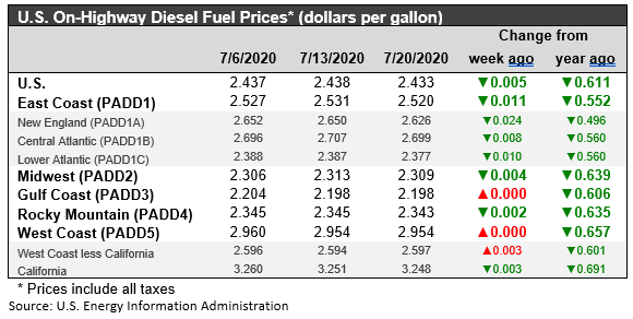 The week ended July 20 brought a 0.5 cents/gallon decrease in the retail price for diesel. For the year to date, diesel prices have fallen by a cumulative 64.6 cents/gallon, a major downward slump that is reversing gradually. In the autumn of 2019, retail diesel prices had been below the $3/gallon mark until the attacks on Saudi Arabian oil facilities in mid-September 2019. They rose at that time, and they remained above the $3/gallon mark until the week ended February 3, 2020. Prices then continued to slide. For the current week, retail diesel prices rose by 0.1 cent to arrive at an average price of $2.438/gallon. Prices fell in PADDs 1, 2 and 4, and they remained unchanged in PADDs 3 and 5. The national average price for the week was 61.1 cents/gallon below where it was during the same week last year.