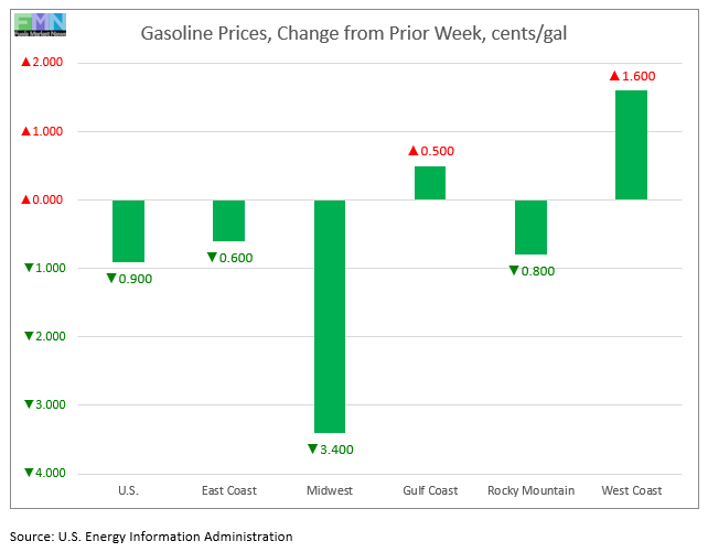 In the Midwest PADD 2 market, retail gasoline prices fell by 3.4 cents to average $2.091/gallon. PADD 2 prices for the week were 59.8 cents/gallon lower than they were for the same week last year.