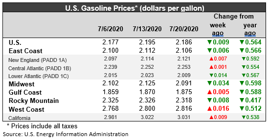 The COVID-19 pandemic is having a massive impact on the U.S. gasoline market. With the phased re-opening of the economy, demand is rising, as are prices. However, the economic reopening has led to a massive increase in coronavirus infections, and some states are being forced to rethink their strategies, particularly regarding indoor dining and drinking. During the week ended June 8, U.S. retail gasoline prices finally regained the $2/gallon threshold, after falling below this level during the week ended April 6 and remaining there for the next nine weeks. During the current week ended July 20, average retail prices for gasoline retreated by 0.9 cents/gallon to average $2.186/gallon. Prices fell in PADDs 1, 2 and 4, while rising in PADDs 3 and 5. Retail gasoline prices for the current week were 56.4 cents per gallon lower than they were one year ago. Until November, gasoline prices had been below their levels of last year. Prices then rose to surpass last year’s levels in all PADDs. The downhill price slide changed this, making gasoline a bargain. Until the pandemic, it had been over four years since the average retail price for gasoline was below the $2/gallon mark.