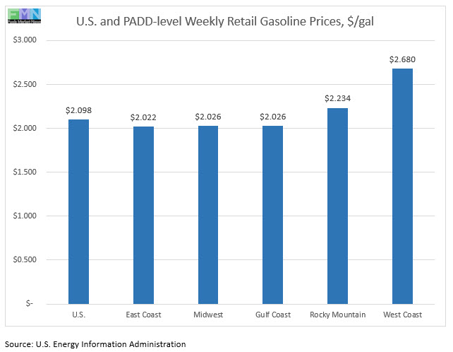 In the Midwest PADD 2 market, retail gasoline prices rose by 3.9 cents to average $2.026/gallon. PADD 2 prices for the week were 51.5 cents/gallon lower than they were for the same week last year.