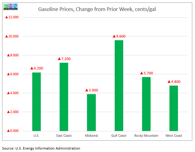 For the week ended June 15, retail prices for gasoline rose by 6.2 cents/gallon. Retail prices for diesel rose by 0.7 cents/gallon.