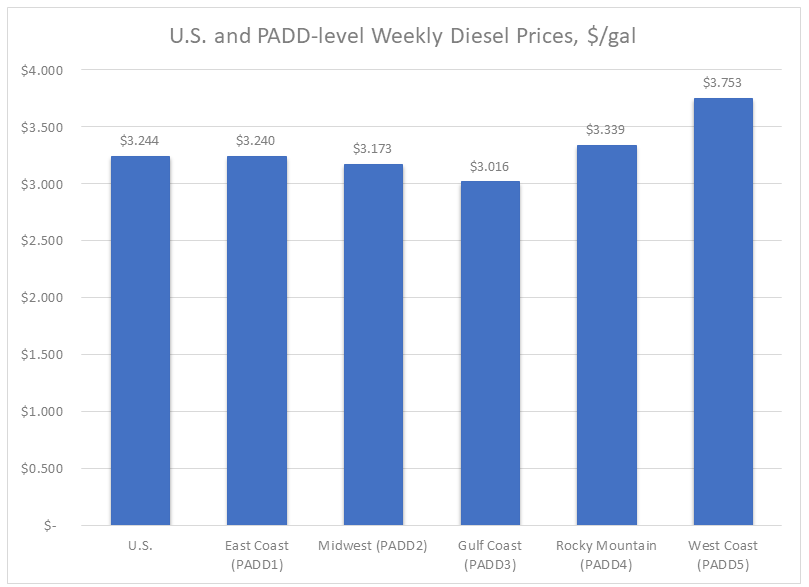 In the Gulf Coast PADD 3, retail diesel prices fell by 2.1 cents to average $3.016/gallon. This price was 68.7 cents higher than for the same week in the previous year. Until the week ended May 14, PADD 3 had been the only market where diesel prices had remained below $3/gallon.