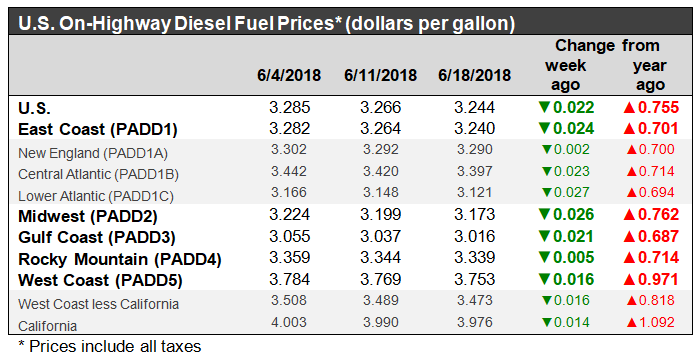 The U.S. Energy Information Administration (EIA) released its weekly data on diesel and gasoline retail prices for the week ended June 18, 2018. On a national average basis, gasoline prices dropped by 3.2 cents, and diesel prices fell by 2.2 cents. Prices for both fuels fell in all PADDs countrywide.