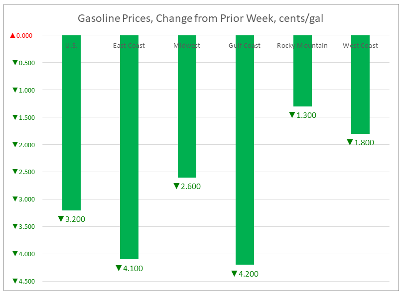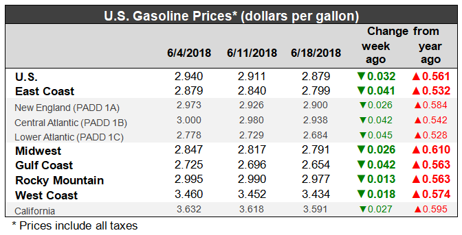 U.S. retail gasoline prices fell by 3.2 cents to average $2.879/gallon during the week ended June 18. Prices fell in all PADDs. The national average price was 56.1 cents per gallon higher than it was one year ago.