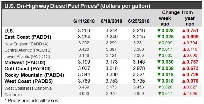 The U.S. Energy Information Administration (EIA) released its weekly data on diesel and gasoline retail prices for the week ended June 25, 2018. Prices for both fuels continued to subside. On a national average basis, gasoline prices dropped significantly by 4.6 cents, and diesel prices fell by 2.8 cents. Prices for both fuels fell in all PADDs countrywide.