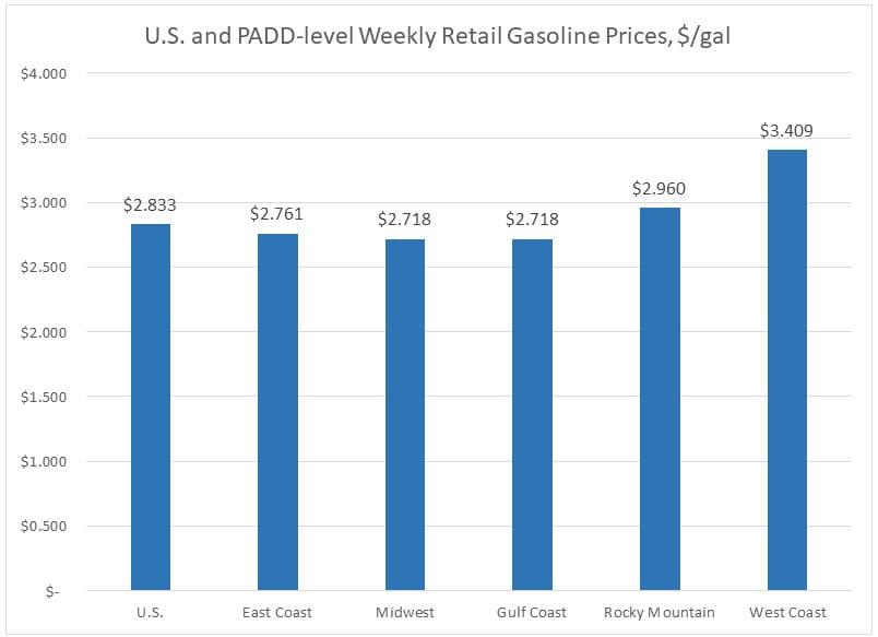 In the Rocky Mountains PADD 4 market, gasoline pump prices fell by 1.7 cents to average $2.960/gallon. PADD 4 prices were 57.1 cents higher than at the same time in 2017.