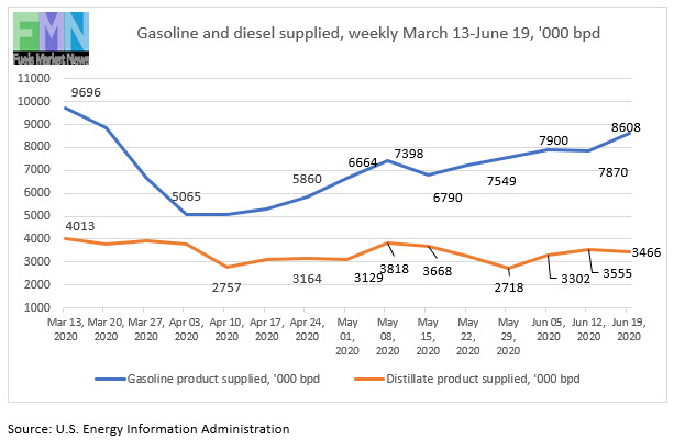 The U.S. Energy Information Administration (EIA) released its weekly data on diesel and gasoline retail prices for the week ended June 29. Retail prices for gasoline rose for the ninth consecutive week, by 4.5 cents per gallon. Diesel prices, which have not yet shown a strong rebound, managed to rise by 0.5 cents per gallon. The COVID-19 pandemic caused severe demand destruction, which is reversing gradually. The EIA publishes weekly “product supplied” data as its proxy for demand. These data show gasoline demand crashing from 9,696 barrels per day (kbpd) during the week ended March 13 to just 5,065 kbpd during the week ended April 3, a huge hit of 4,631 kbpd in just four weeks. That was the low point. Data for the week ended June 12 show that gasoline demand has recovered to 8,608 kbpd. The EIA points out that “product supplied” is not a precise measure of demand, but these data provide the most up-to-date numbers publicly available.
