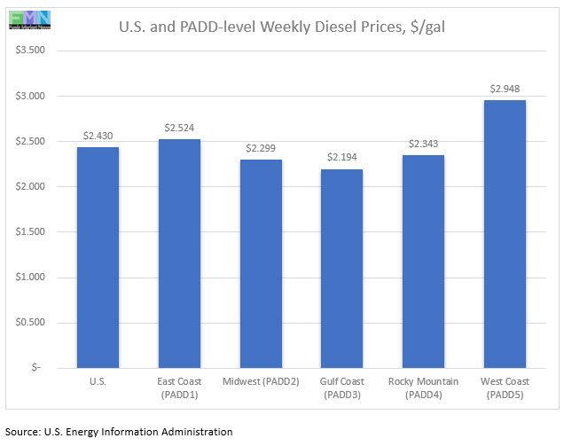 In the Gulf Coast PADD 3, retail diesel prices receded by 0.3 cents to average $2.194/gallon. PADD 3 continues to have the lowest diesel prices among the PADDs, currently 23.6 cents below the U.S. average. Prices were 60.9 cents below their level for the same week in the previous year.